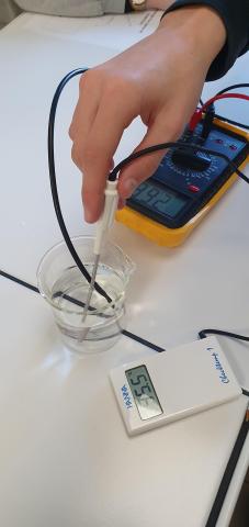 en dérivation avec un générateur réglé à 3,3 volts. Par groupes, ils ont mesuré la température de l’eau ainsi que la tension fournie par le capteur.