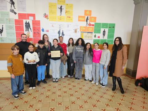 Mme SARAÏS, inspectrice académique d'anglais, est venue vendredi 27 mars pour remettre le prix du patrimoine linguistique aux élèves du collège après avoir bénéficié d'une visite de l'établissement où étaient arborées, dans les couloirs du 2ème étage, de multiples fanions et drapeaux ainsi que les premières productions des élèves. Une mosaïque de langues et de messages personnels sur chaque mur.